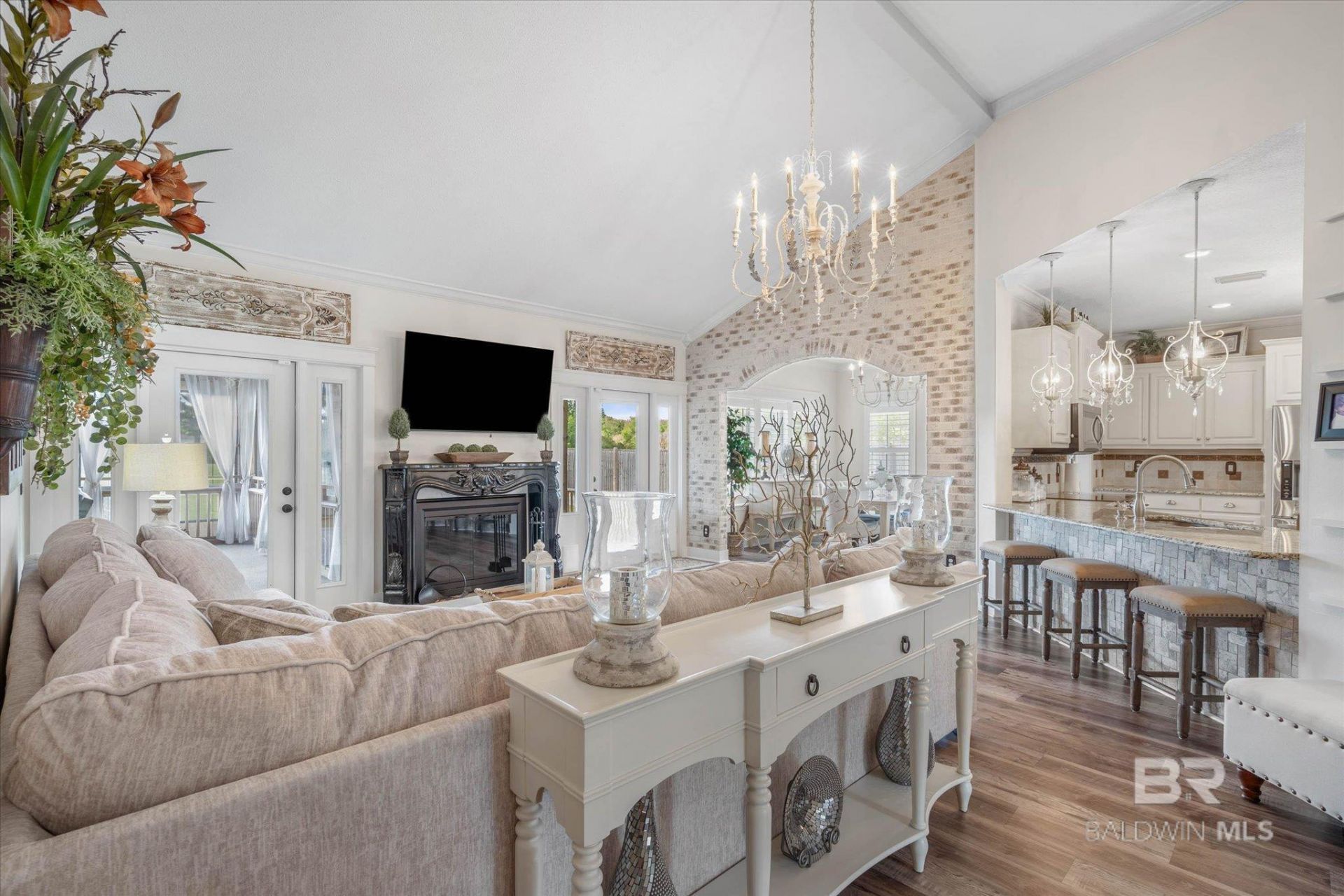 Located on 1.2 acres in Stapleton, this 3 bedroom, 2.5 bath single-family home built in 2007 features an open-concept layout with a living room that includes a brick accent wall and wood-burning fireplace, a separate dining area, and a kitchen with granite countertops, center island, pantry, coffee bar, travertine tiled kitchen island, backsplash, and stainless steel appliances that convey with the home.Vaulted ceilings with rustic wood accents, crown molding, and plantation shutters are found throughout. The primary suite offers a spacious bedroom with a large walk-in closet featuring a built-in ironing board, dual vanities, soaking tub, and separate walk-in shower.Additional features include a large 449 sq ft heated and cooled screened porch (sunroom) with commercial-grade roll-up screens, stone gas propane fireplace, plus two supplemental wall-mounted heating and cooling units, covered deck, and fully fenced backyard. Recent updates include a repainted 2-car garage with sealed floors, new exterior trim, and replaced back steps to the deck. The home has a 2020 roof (not fortified), HVAC approximately 10 years old, and there is no HOA. A separate 600 sq ft rental apartment and a 30x40 barn is included on the property. Buyer to verify all information during due diligence.